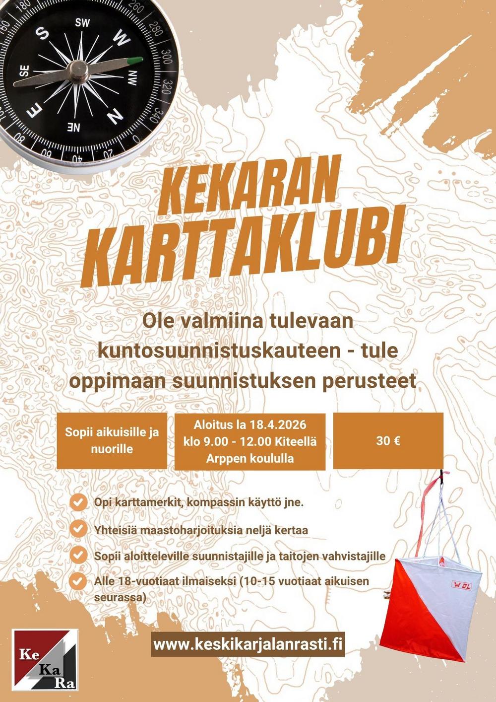 Ilmoittautumiset Auli Hirvonen, puhelin 0400503112 tai hirvonen.auli(at)gmail.com 16.4.2026 mennessä! Hinta 30 euroa/osallistuja, sisältäen opetuksen ja käytettävät kartat. Alle 18-vuotiaat pääsevät osallistumaan karttaklubeille ilmaiseksi (10-15 vuotiaat vain huoltajan/aikuisen kanssa).